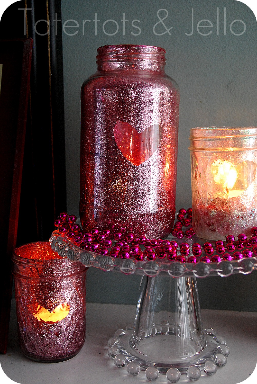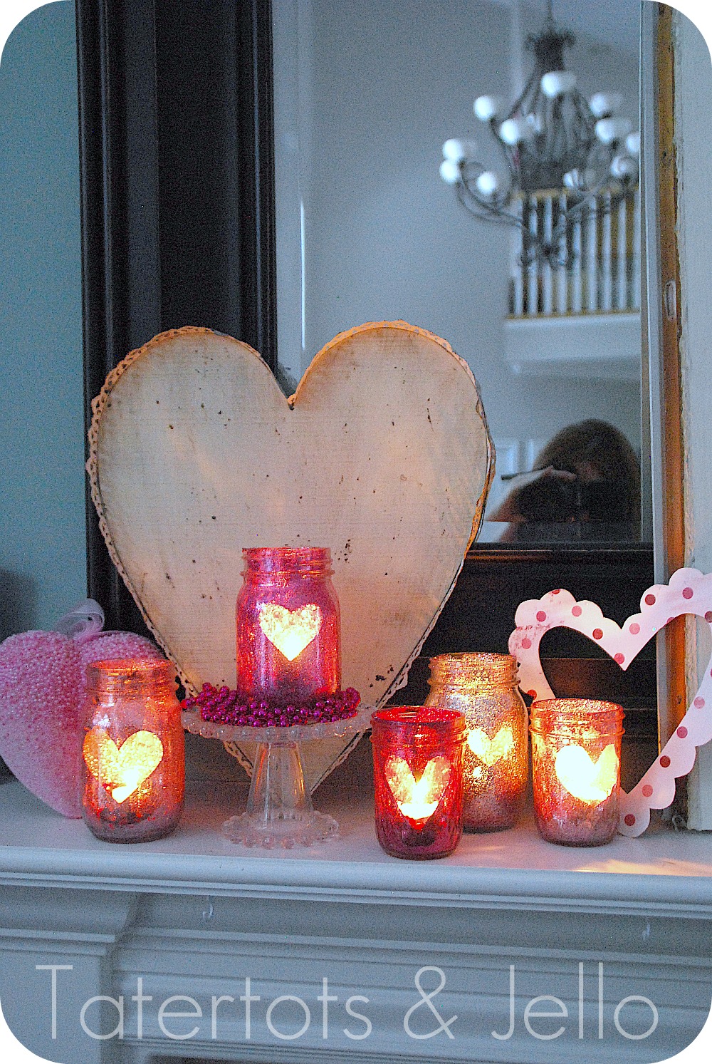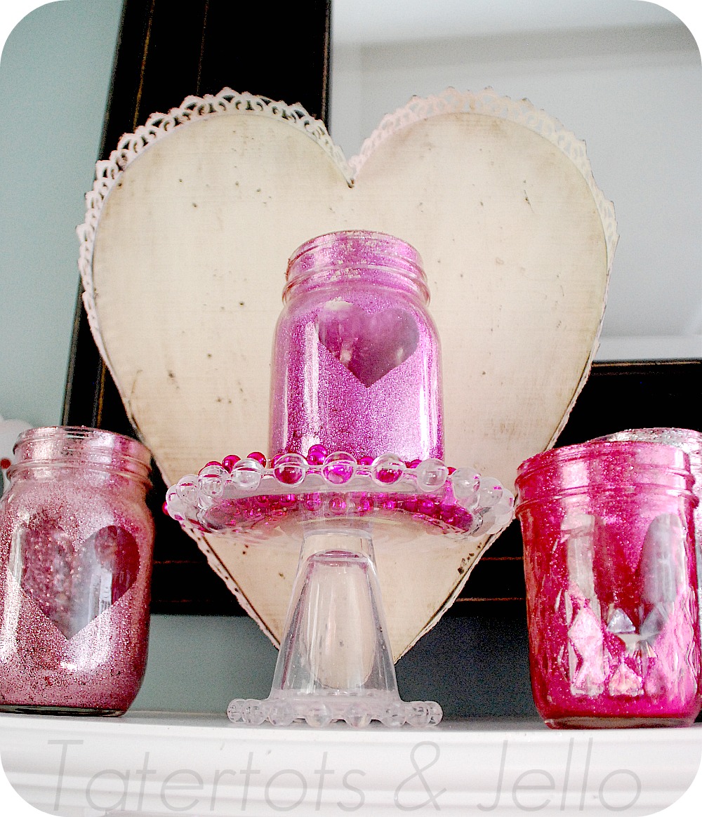 I love the way the light reflects off the glitter and shines through the heart opening in the mason jars.